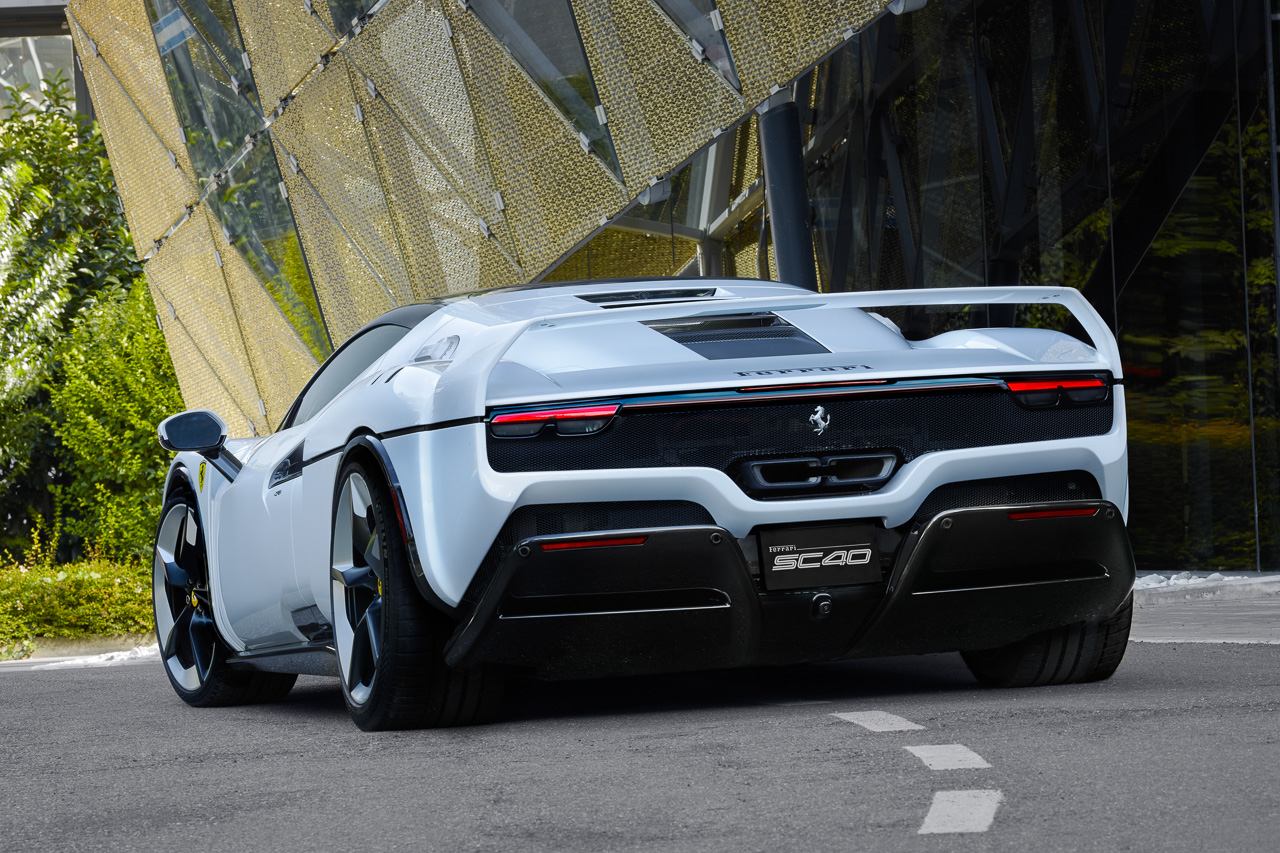 The unique styling of the Ferrari SC40 draws directly from the 80s supercar with its long & low nose, short overhangs, a huge rear wing, and the centralized cockpit area. It's also painted in a unique shade simply called “SC40 White”, which complements the blacked-out elements on the bumpers, headlights, and door panels.