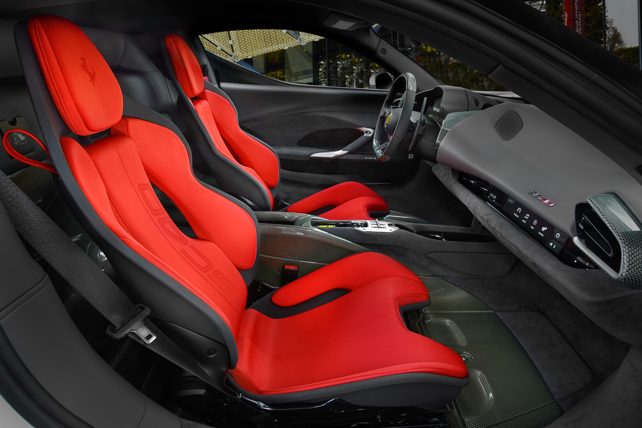 As far as upholstery is concerned, the SC40 features a combination of Charcoal Alcantara and a red Jacquard technical fabric. Topping everything off are the Prancing Horse on the headrests and the woven SC40 logo that give the seats an exclusive look.