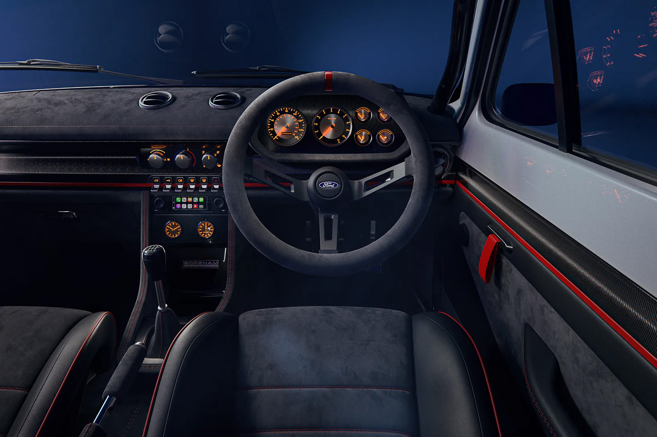 From an aesthetic standpoint, design director Wayne Burgess has stripped away the quarter bumpers and main direction indicators for a “sleeker and more purposeful silhouette”. Aside from the mandatory flared wheel arches, Race fans will also recognize the headlights that take inspiration from the taped-over square headlamps used during the original Mk1’s racing exploits. More particularly the the Alan Mann Racing Team, a legendary British racing team that raced Escorts during the Seventies.