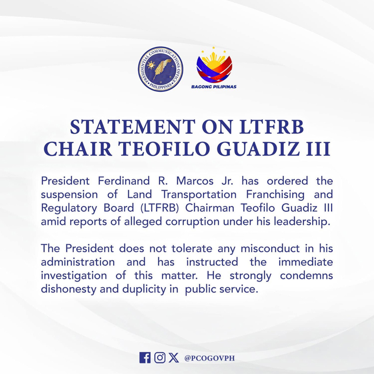 In a statement published by the Presidential Communications Office (PCO), it said that the President does not tolerate any misconduct under his administration.