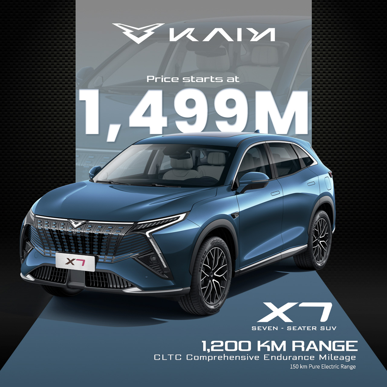 â— X7 PHEV SUV – A seven-seater plug-in hybrid electric vehicle (PHEV) sports utility vehicle (SUV) with a combined range of 1,200 kilometers. With a starting price of ₱1,499,999, it offers a perfect balance of power, efficiency, and value.