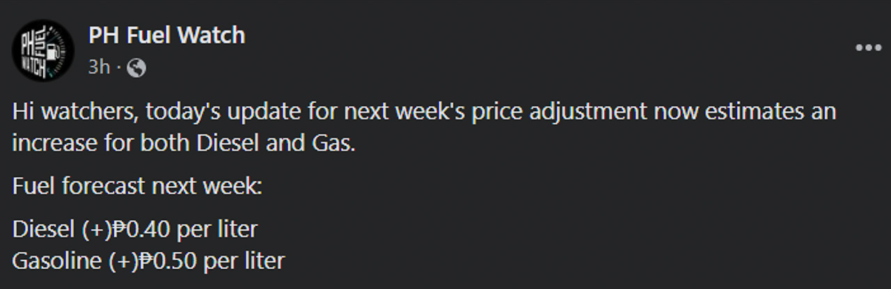 Current estimates say diesel could go up by PHP 0.40 per liter, gasoline by PHP 0.50