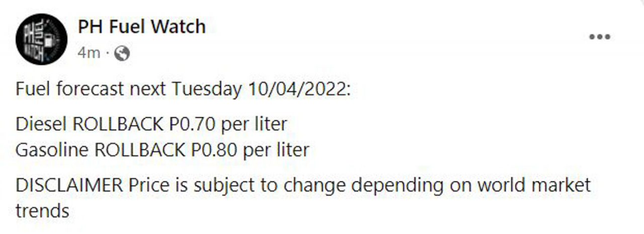 However, the latest forecast from our friends at PH Fuel Watch may put those worries to rest in the meantime, as another round of rollback is expected to happen next week. Their current estimates from the Mean of Platts Singapore (MOPS) show diesel prices could go down a further PHP 0.70 per liter, while gasoline rollback is estimated at around PHP 0.80 per liter.