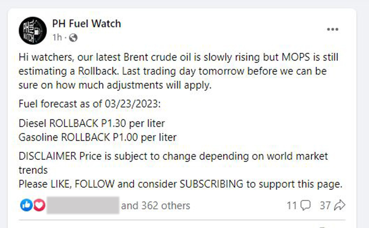 MOPS estimates suggest a fuel price rollback could happen on March 28
