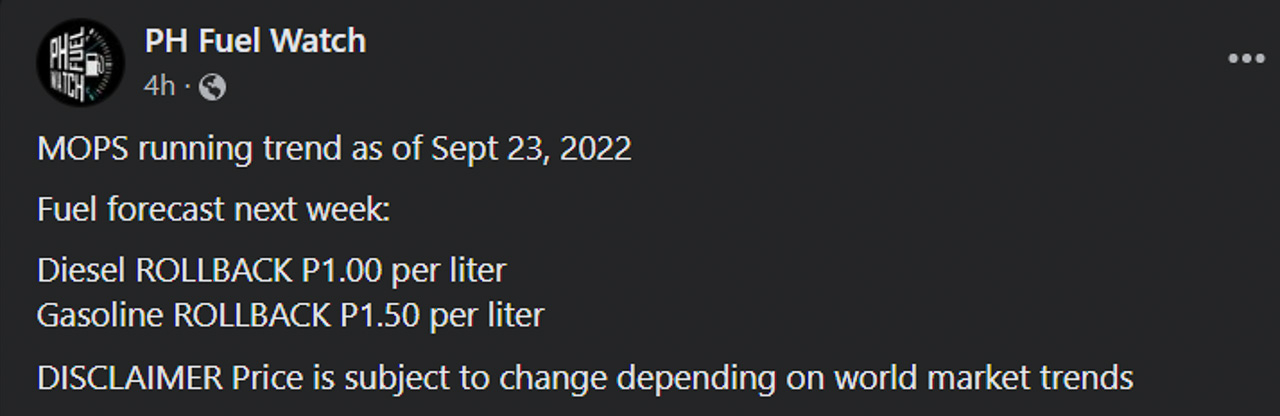 According to our friends over at PH Fuel Watch, current estimates from the Mean of Platts Singapore (MOPS) state that diesel could roll back PHP 1.00 per liter. On the other hand, gasoline might get a bigger rollback at PHP 1.50 per liter.