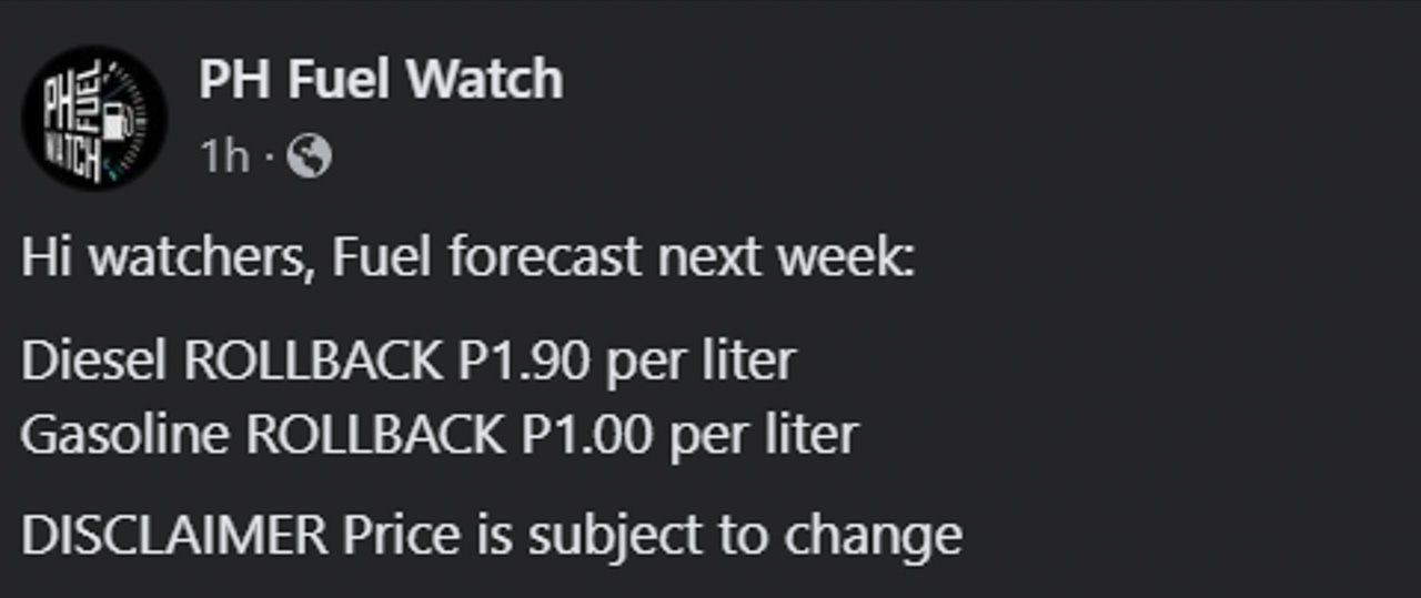 According to estimates released by PH Fuel Watch, gasoline prices are estimated to go down by PHP 1.00 per liter. On the other hand, diesel fuel is expected to become cheaper by PHP 1.90 per liter next Tuesday.