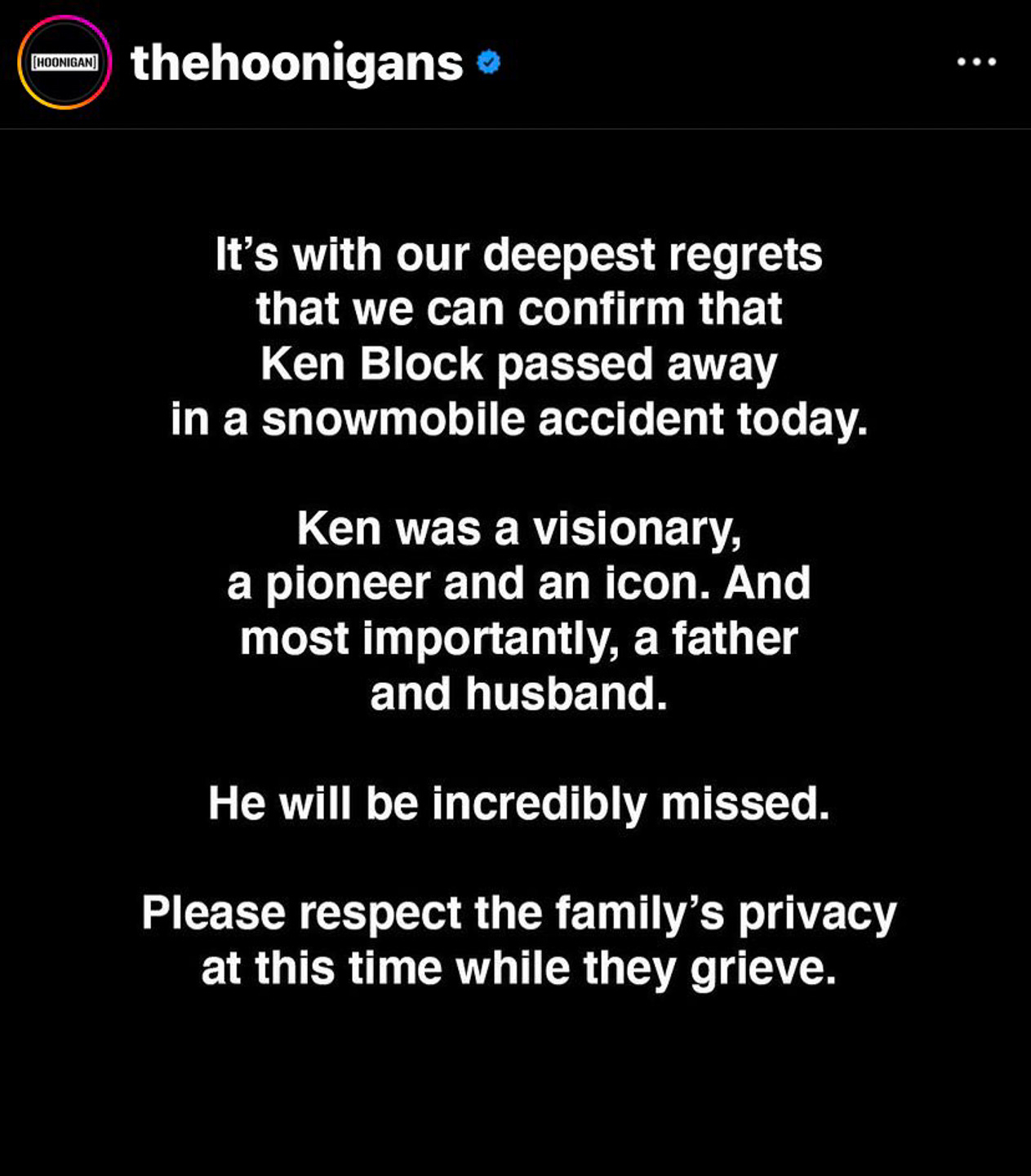 "It's with our deepest regrets that we can confirm that Ken Block passed away in a snowmobile accident today," said Hoonigan. "Ken was a visionary, a pioneer, an icon. And most importantly, a father and a husband".