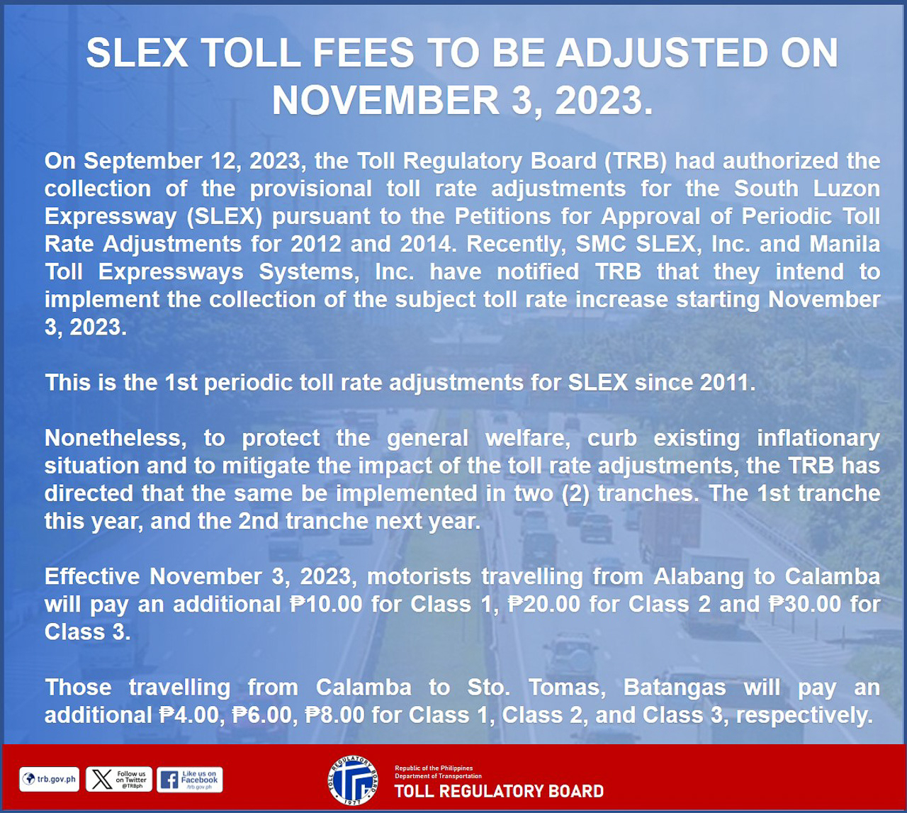 Effective November 3, 2023, the toll rates along SLEX will increase for the first time since 2011. This comes after the TRB approved the Petitions for Approval of Periodic Toll Rate Adjustments for 2012 and 2014. Recently, San Miguel Corporation (SMC) SLEX Inc. and the Manila Toll Expressways Systems, have notified the TRB that they intend to implement the collection of the subject toll rate increase.