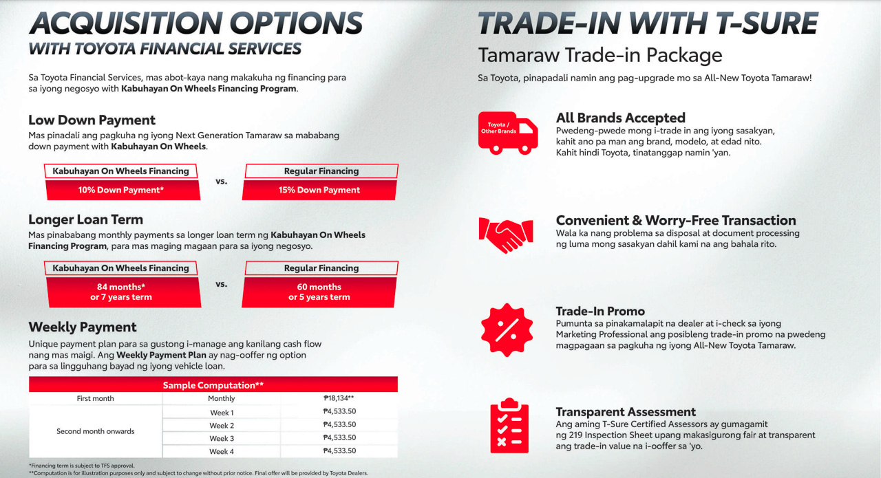 Order books for the all-new Toyota Tamaraw are now open. The company has yet to reveal the official pricing of the Tamaraw variants although Toyota has already revealed acquisition options through Toyota Financial Services. Low Down Payments of 10% are available as well as longer loan terms of up to 84 months (or 7 years). There's also the option of weekly payments of up to PHP 4,533. Interested customers can also get the all-new Tamaraw via the Toyota's T-Sure Trade-In Package.