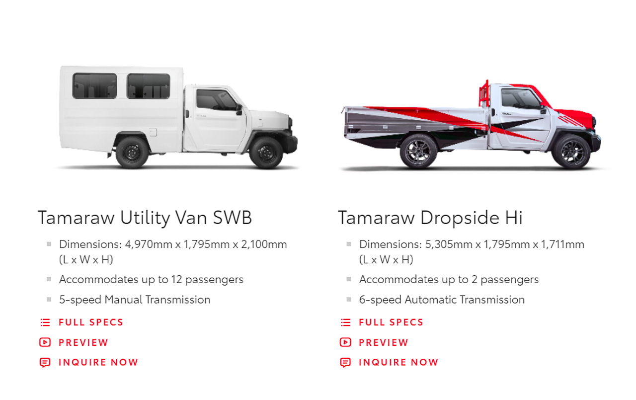 Get the all-new Toyota Tamaraw in Utility Van LWB/SWB, Aluminum Van, and Dropside pickup