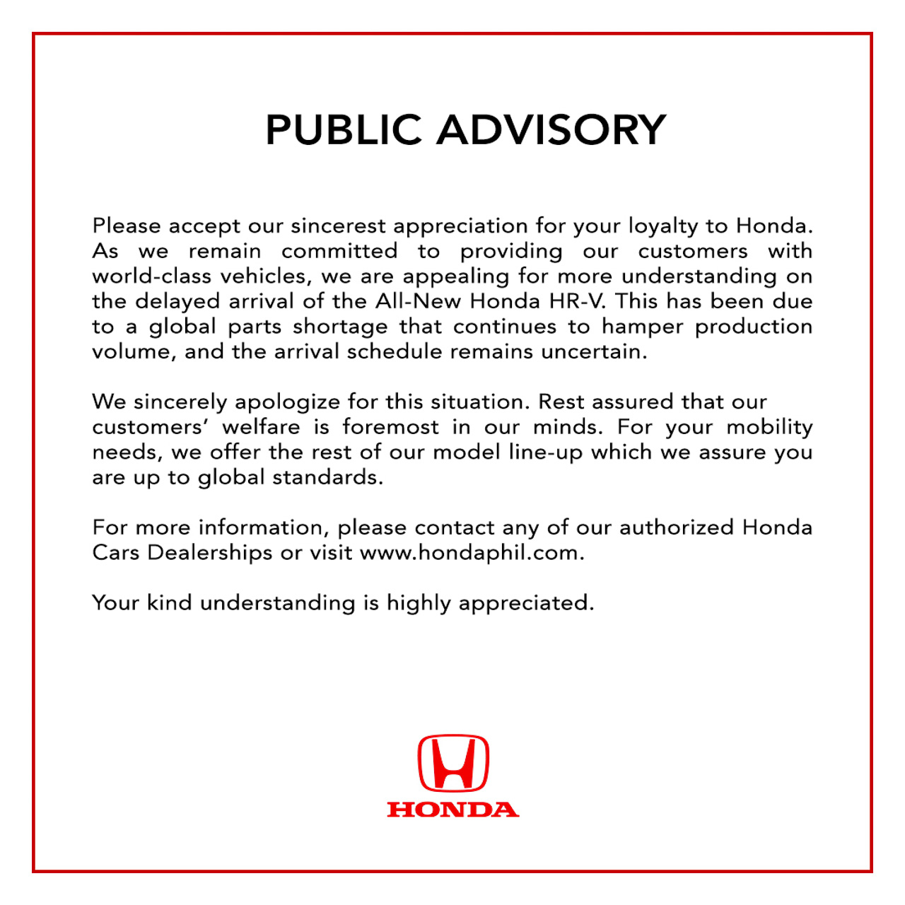Honda Cars PH appealing for more understanding due to delays