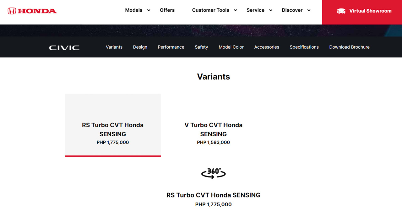 Unfortunately, Honda Cars Philippines Inc (HCPI) has quietly axed the base model Civic. While we were browsing the automaker's website, we noticed that there were only 2 variants left of the sedan in the price section. We even checked the Civic's page and saw that the RS and V are the only models available.