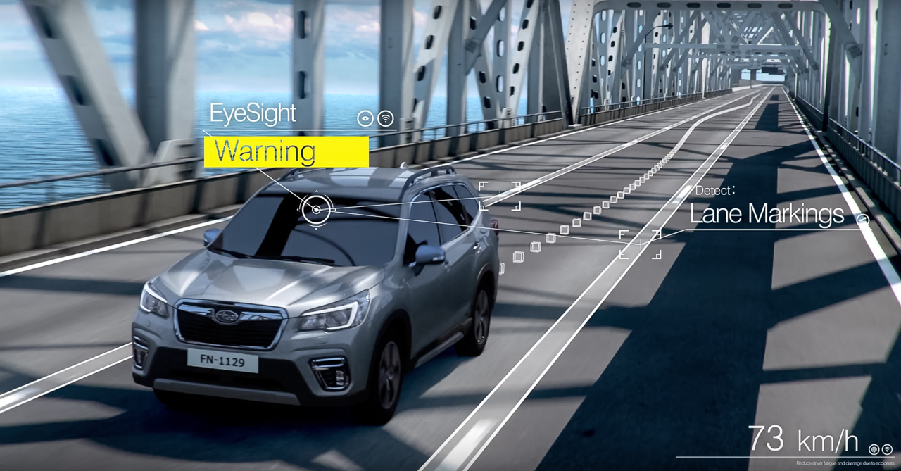 But EyeSight takes the idea even further. The camera system not only monitors traffic but road markings as well. That's right, those cameras actively check if you're staying within your lane, and will alert you if you're getting too close or exceeding the lines. That makes for safer high-speed highway driving.