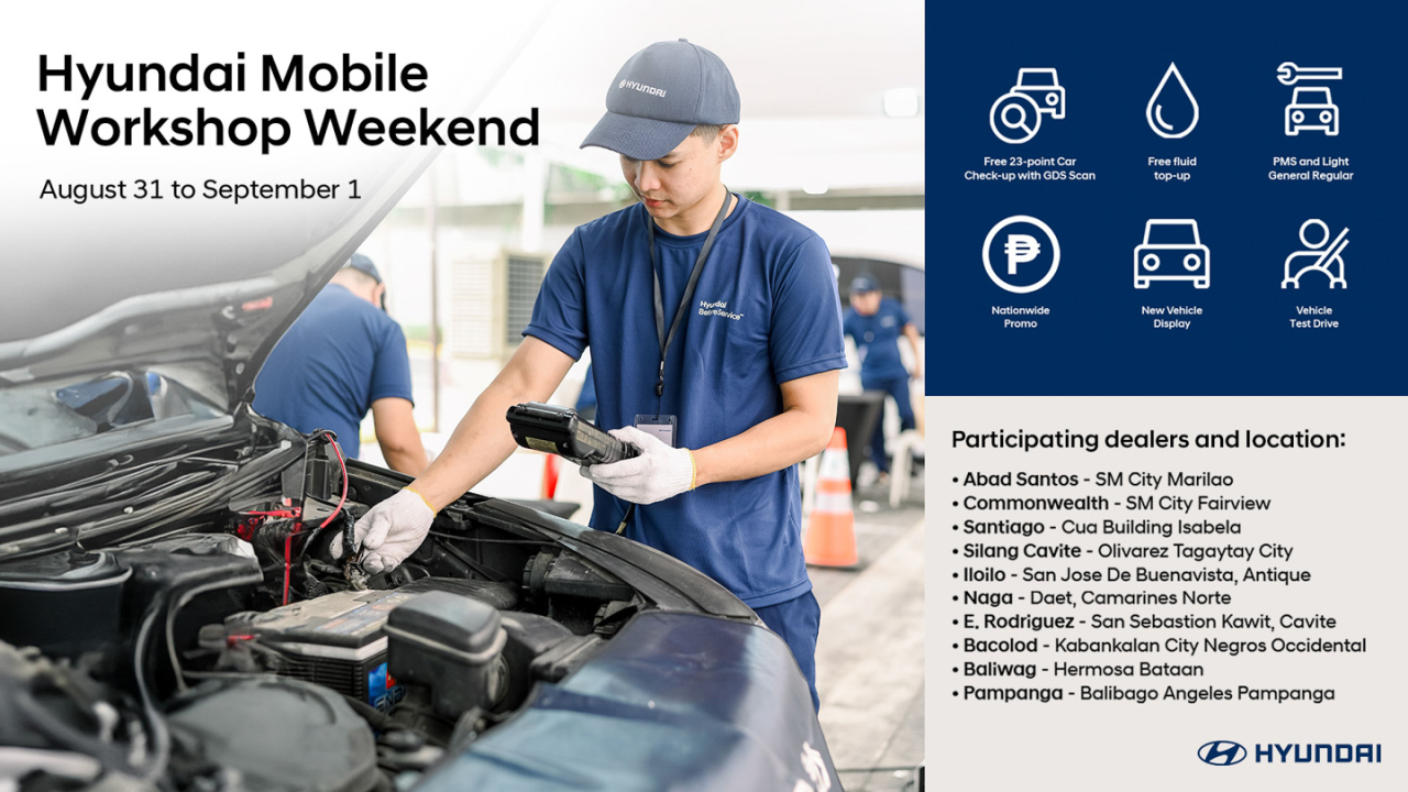 Car owners who bring in their vehicle of any car brand can avail a free 23-point check-up, top-up of fluids, and light general repairs through the Hyundai Mobile Service (HMS) units; terms and conditions apply.