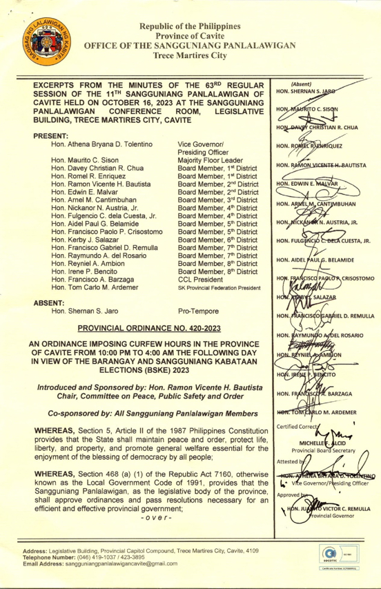 Unlike other local curfew ordinances which only target minors, Section 3 of the Provincial Ordinance 420-2023 specifically states that “During the period from October 19, 2023, to October 30, 2023, 10:00 PM to 4:00 AM, a curfew shall be in effect within the boundaries of the province. During this time, all individuals, regardless of age, shall remain indoors and shall not loiter or assemble in public places.”