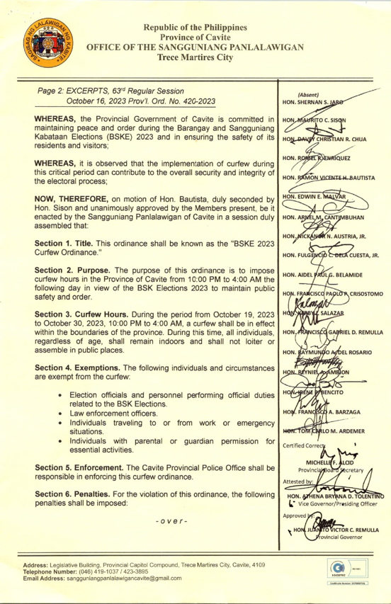 The ordinance took effect on October 19, 2023, and will end at midnight of October 30, 2023 – the day of the Barangay and SK elections.