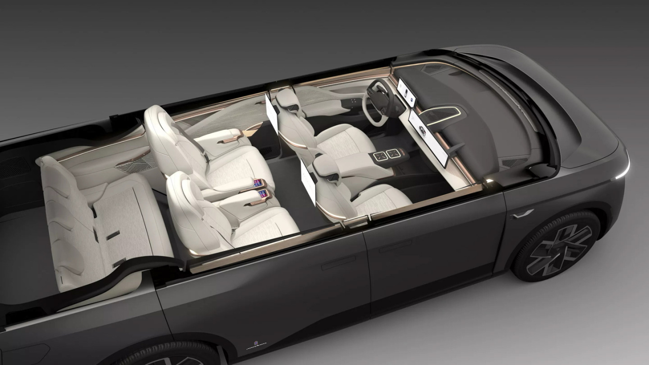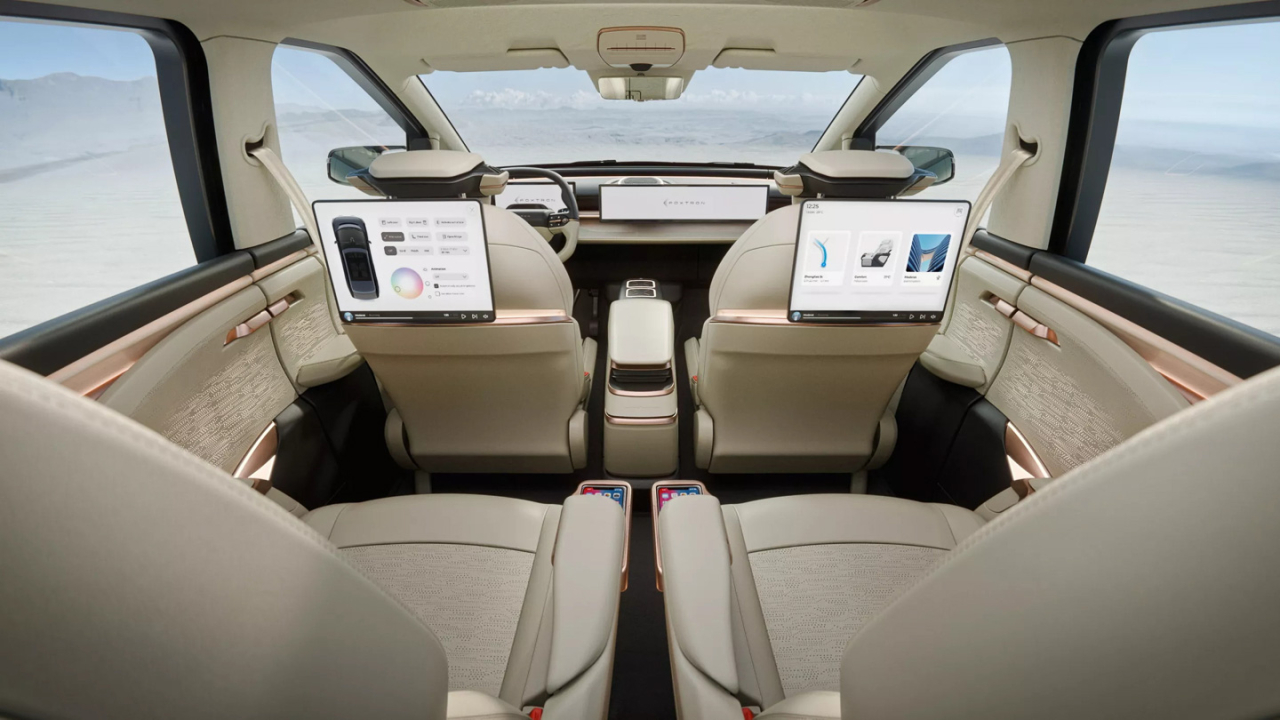 Inside, there’s room for seven with its 2+2+3 layout, and the second row comes with captain’s chairs. As expected, the dashboard flexes Foxconn’s expertise in electronics, showing a digital instrument cluster and a wide infotainment touchscreen display in the middle.