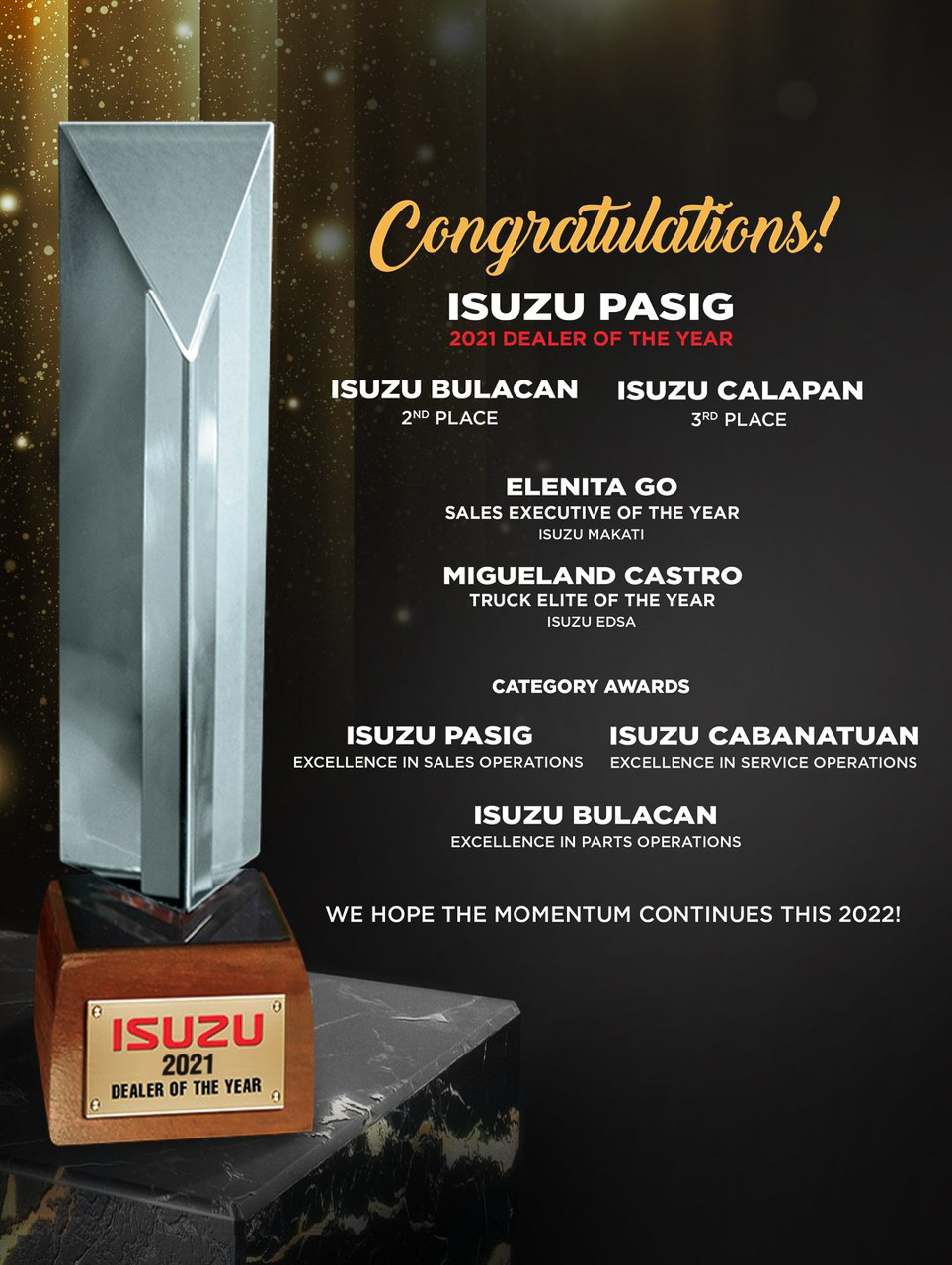 IPC president Hajime Koso congratulated and expressed gratitude to the awardees. He also mentioned that 2022 is the start of a new era for Isuzu as they introduce a more sustainable and eco-friendlier route for the entire network in line with the United Nation’s SDGs or Sustainable Development Goals for its products, operations, and customer service.