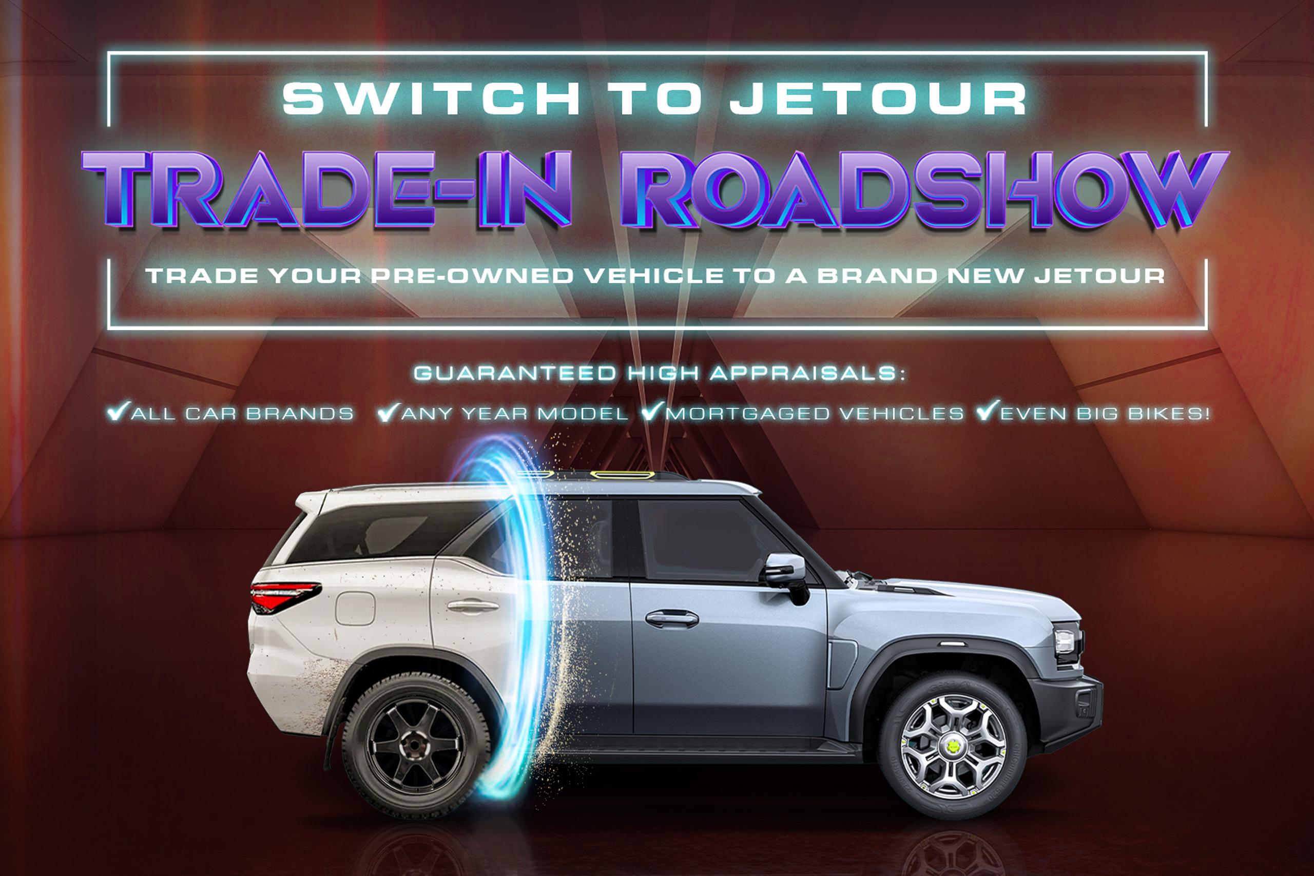 Jetour Auto Philippines' innovative Trade-In Roadshow will be held at the following dealerships and dates: Jetour Auto Pasig and Quezon Avenue from July 12 to 14; Jetour Auto Baliuag from July 19 to 21; Jetour Auto Edsa Centris from July 26 to 28, and; Jetour Auto Alabang from August 2 to 4.