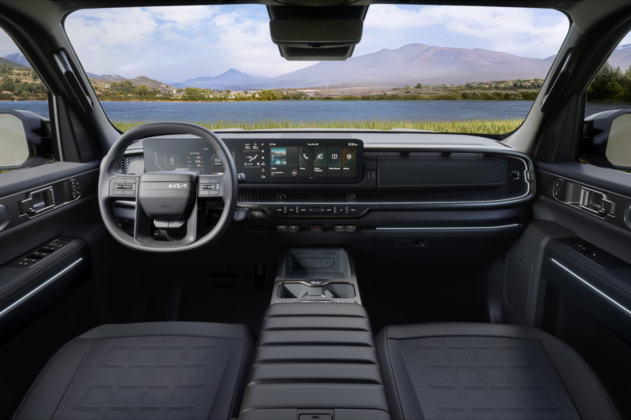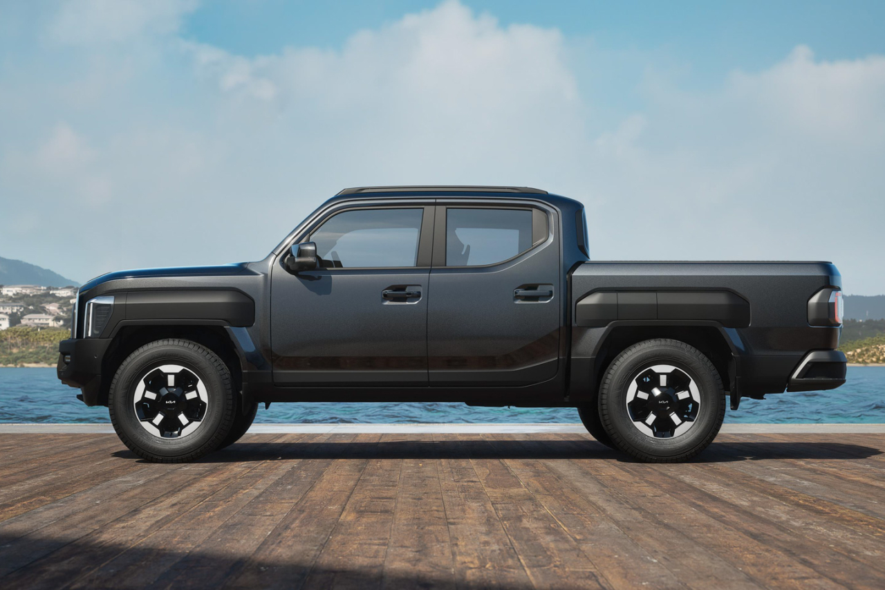 The bold silhouette is Kia’s idea of projecting power, confidence, and capability on a pickup truck. The front gets a vertically oriented lighting setup on the headlights, while the hood trim and expansive grille frame feature the signature Kia Tiger Face.