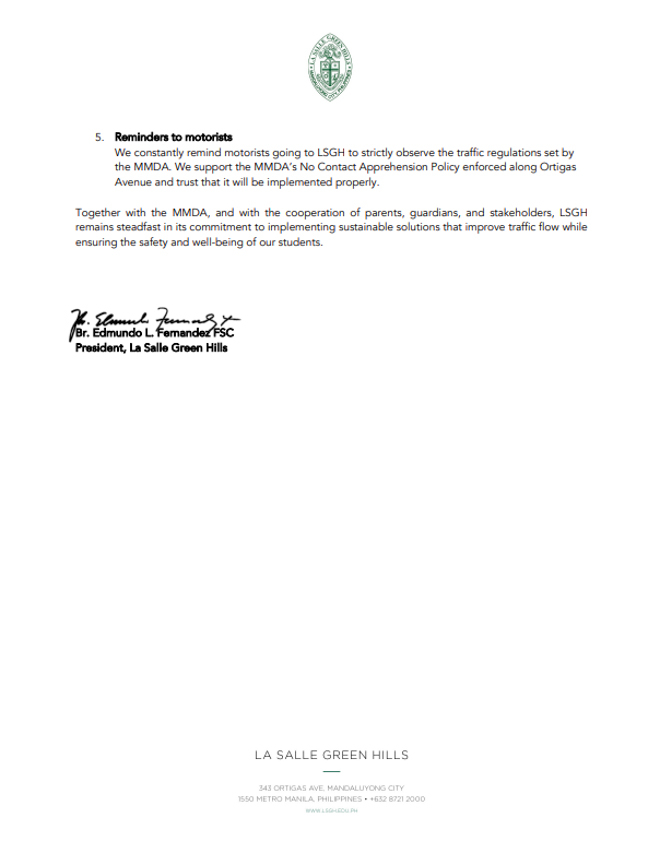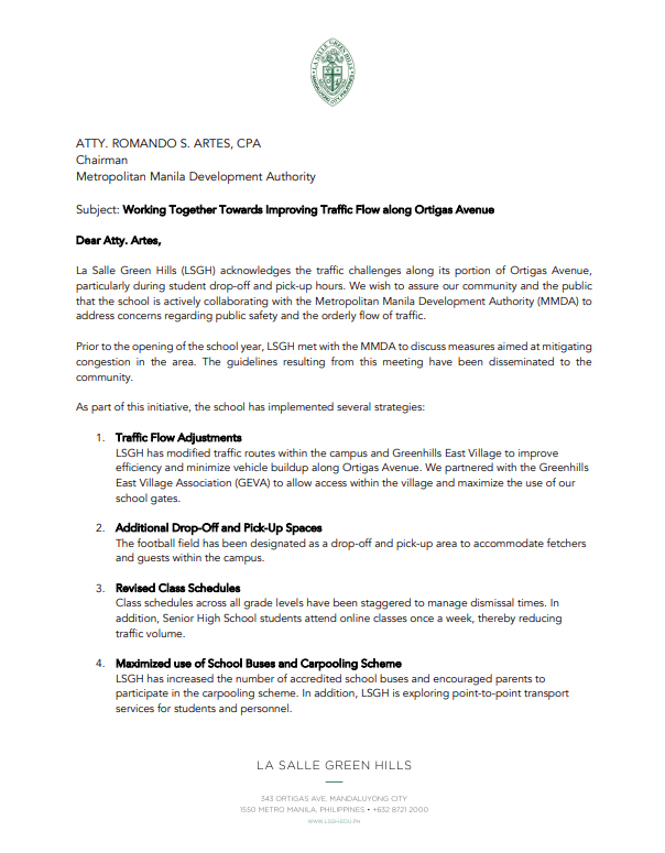 Autoindustriya.com has obtained a copy of a letter from LSGH, addressed to MMDA Chairman Atty. Don Artes. The letter was signed by the school’s president, Brother Edmundo Fernandez, in response to the agency’s earlier advisory.