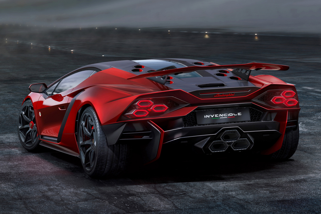 The Invencible coupe is finished in Rosso Efesto, a tone of red highlighted by black carbon accents. Like Lamborghini's current track cars, the Invencible has an aggressive rear spoiler with swan-style mounting brackets and integrated hexagon shapes.