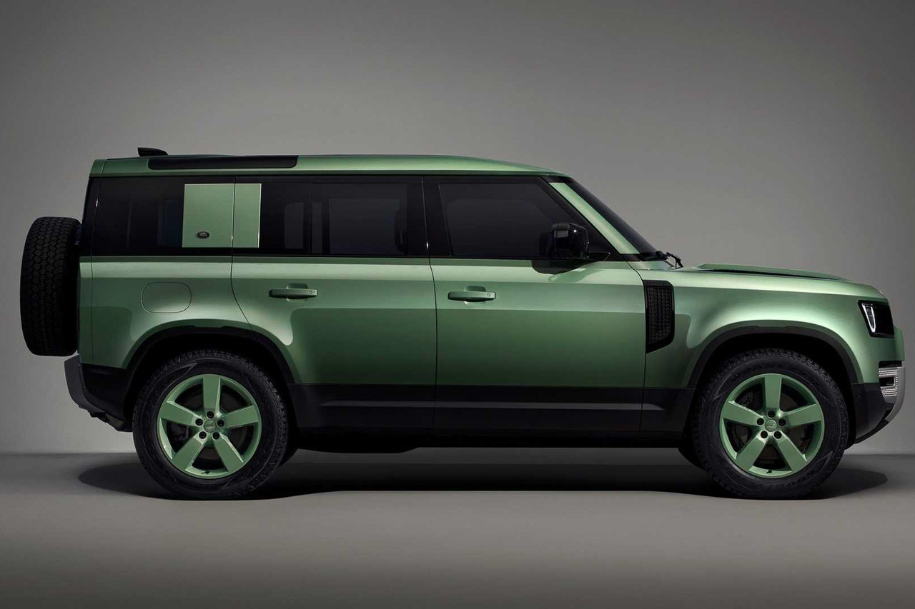 Land Rover is introducing a new color on the Defender 75th, Grasmere Green. It will come with 20-inch alloy wheels, also in the same color, and with matching center caps. On its body are a 75 Years graphic, Ceres Silver bumpers, and privacy glass.