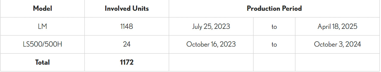 In the Philippine market, the special service campaign affects a total of 1,172 vehicles, with the Lexus LM taking the largest share of the recall, at 1,148 units. Also part of the recall are 24 units of the Lexus LS 500 and 500h.