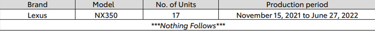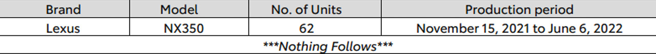 A total of 62 examples of the Lexus NX 350 are part of the campaign in the Philippines which were built between Nov 15, 2021, to June 6, 2022.