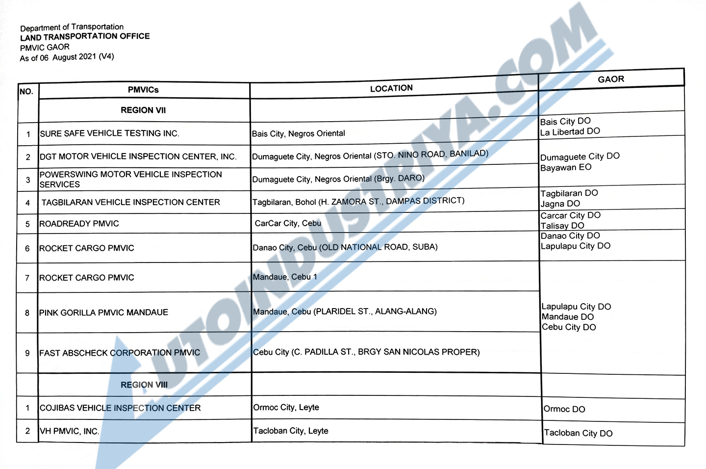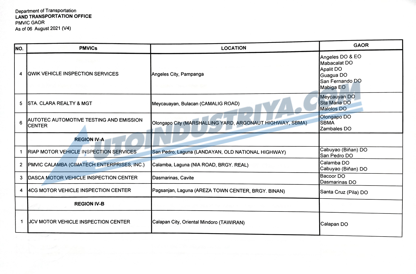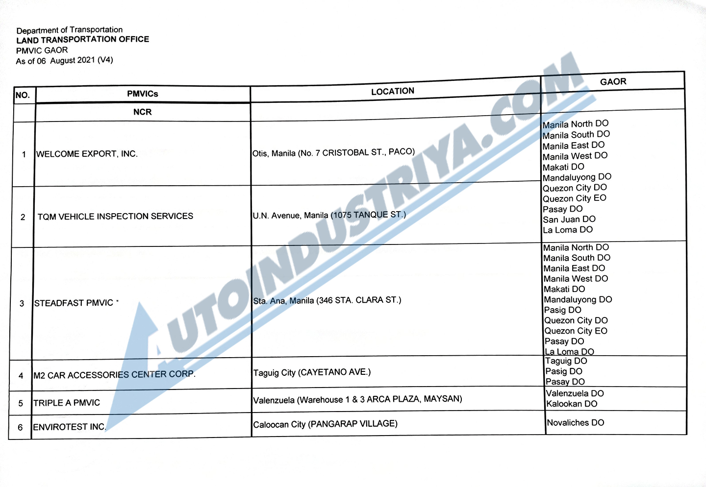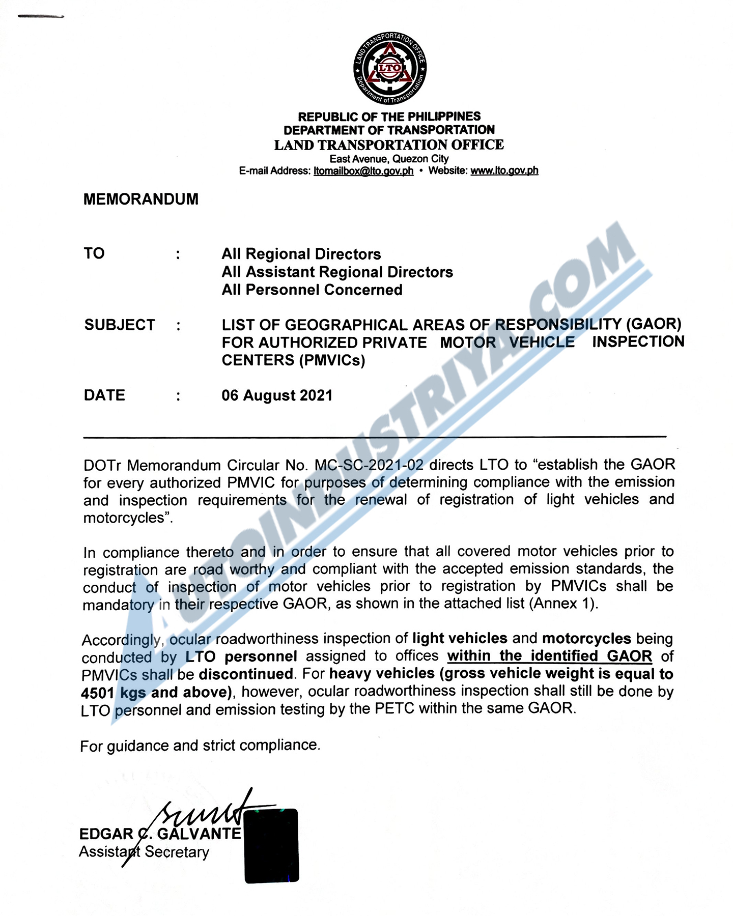 The Memorandum makes it clear that any LTO DO or EO in the GAOR list will only allow the renewal of a motor vehicle's registration if the MVIR is from a PMVIC within the GAOR. The visual roadworthiness inspection at LTO branches in the list below will also be ceased with the exception being for heavy vehicles (4501 kg GVW or heavier); in this matter, the roadworthiness inspection will be conducted by the LTO and an emissions test from a Private Emission Testing Center (PETC) within the same GAOR will be acceptable.