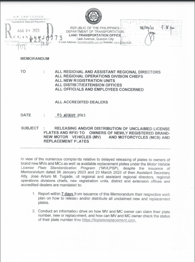 The memorandum dated August 3, 2023, states four directives that LTO officials, as well as dealers, should comply with.