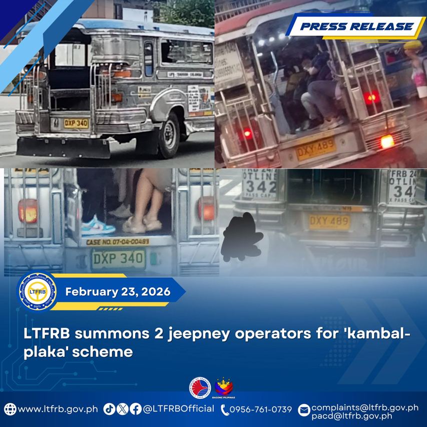 The Land Transportation Franchising and Regulatory Board (LTFRB) has issued Show Cause Orders (SCOs) to two jeepney operators over their alleged involvement in a “kambal plaka” scheme, in which two or more vehicles use the same license plate.