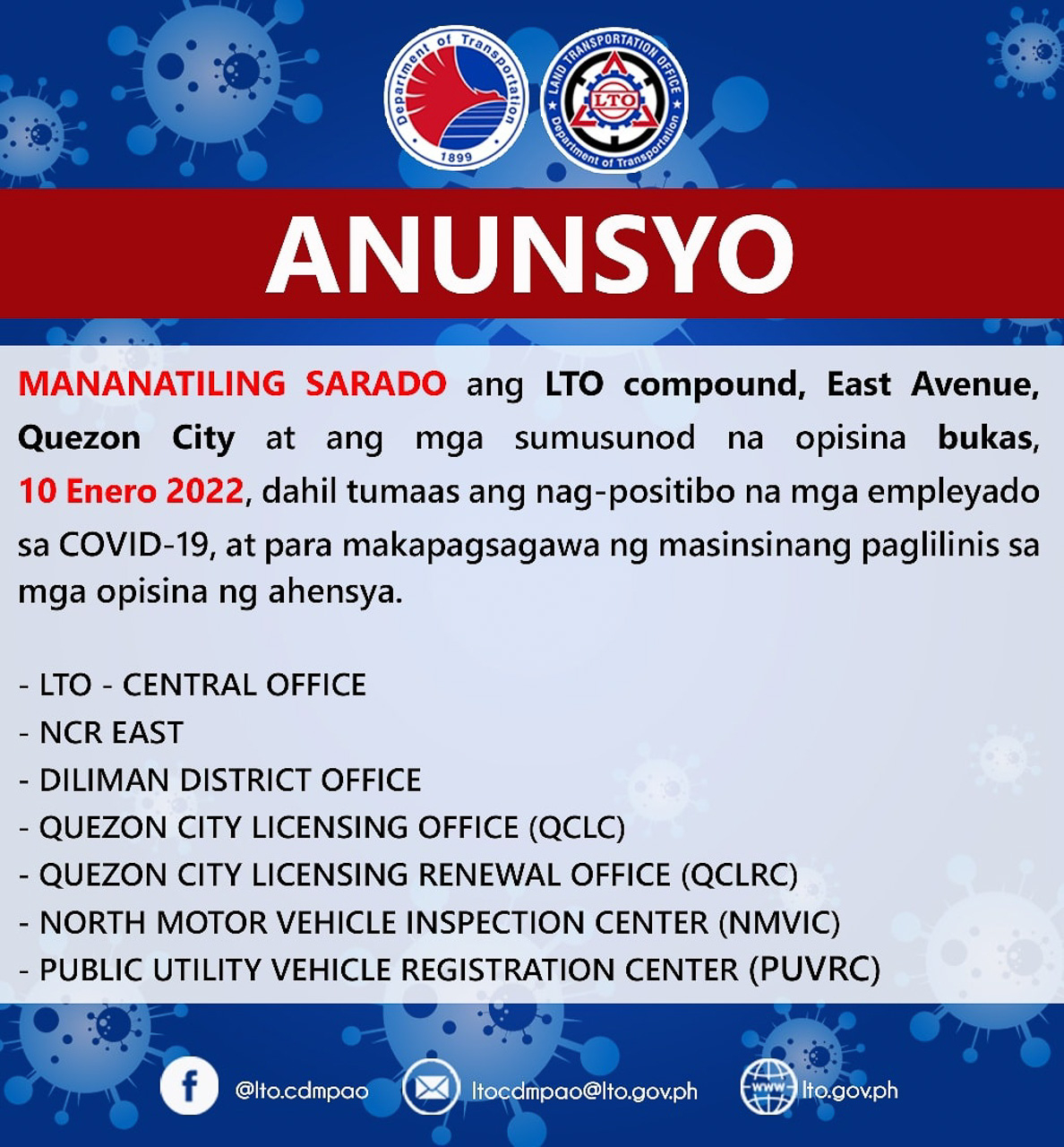 With the following offices closed, the government agency said that they will be conducting thorough disinfection in all of the closed offices and renewal centers. This is to ensure that both customers and employees are safe once they reopen to the public.
