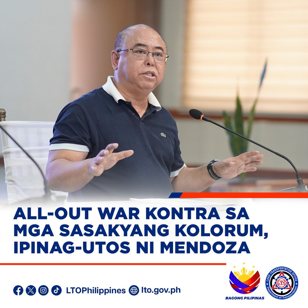 Part of Mendoza's order to rid the streets of colorum vehicles is that LTO regional directors must work together with other agencies like the Land Transportation Franchising & Regulatory Board (LTFRB), the Metropolitan Manila Development Authority (MMDA), and the Philippine National Police – Highway Patrol Group (PNP-HPG).