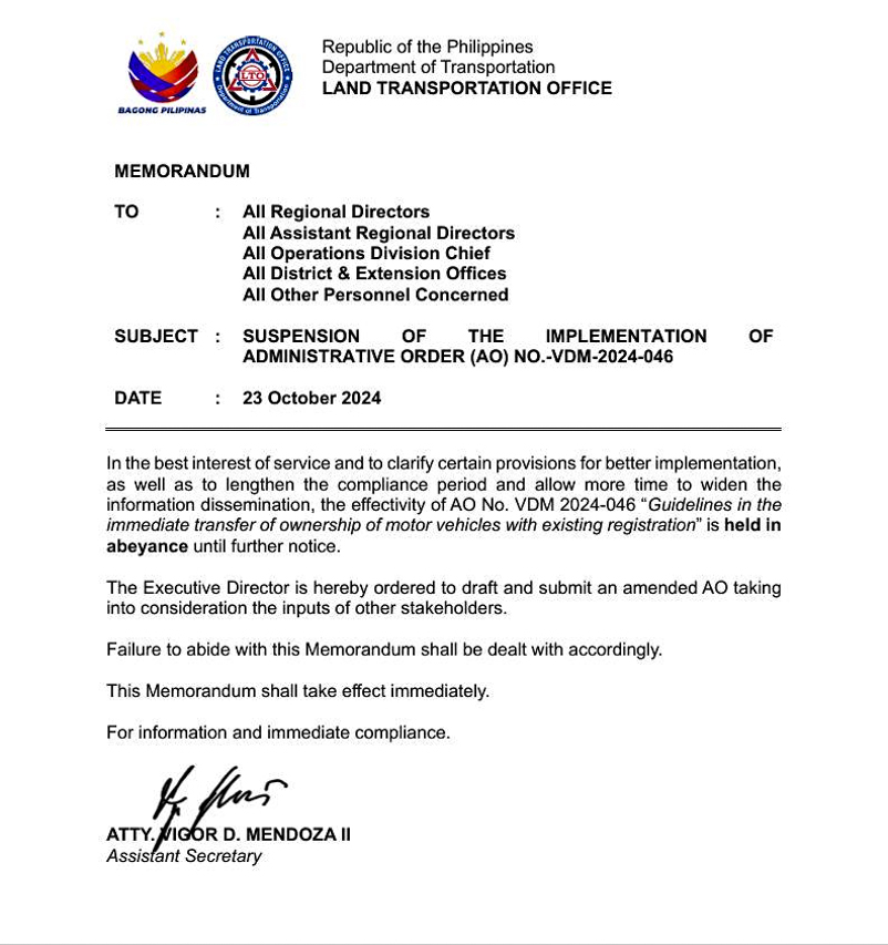 “In the best interest of service and to clarify certain provisions for better implementation, as well as to lengthen the compliance period and allow more time to widen the information dissemination, the effectivity of AO No. VDM-2024-046 ‘Guidelines in the immediate transfer of ownership of motor vehicles with existing registration’ is held in abeyance until further notice.”