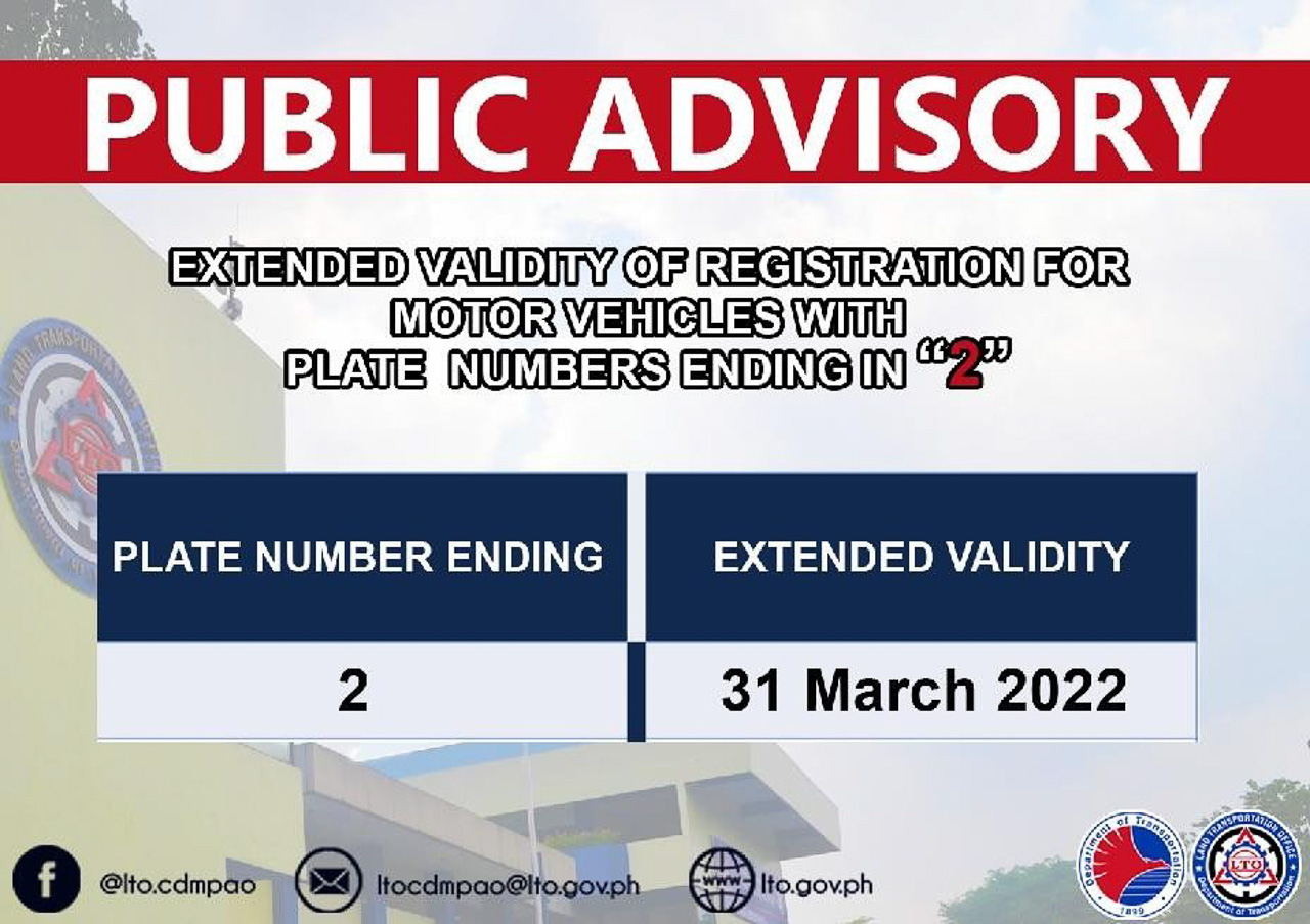 The agency announced yesterday that they have also extended the validity of MV registration for vehicles that end in 2. Instead of being valid only until February 28, 2022, the LTO said that these vehicles will continue to have valid registrations until March 31, 2022.