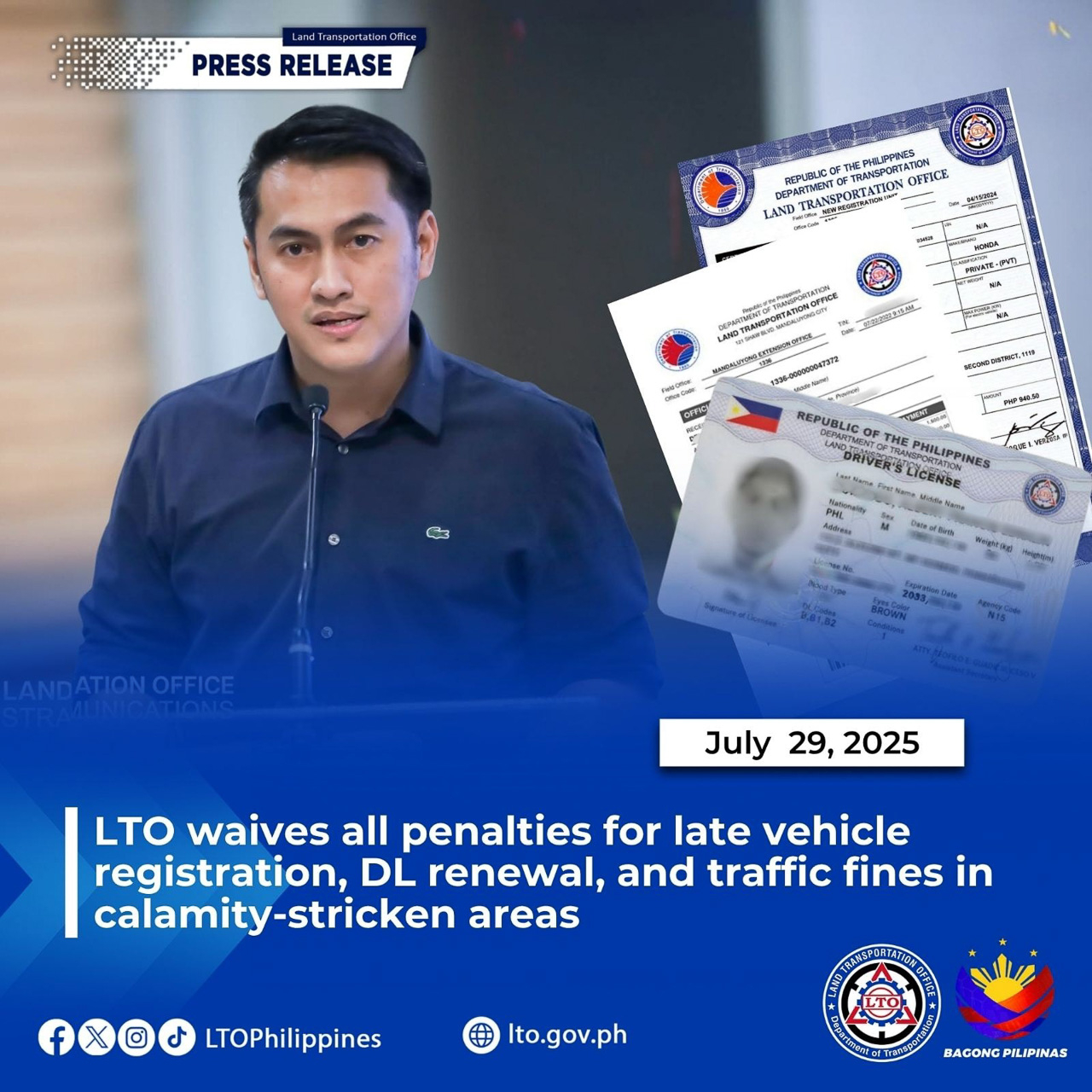 This comes after the Land Transportation Office (LTO) recently announced that it has waived all penalty fines for late vehicle registration and driver's license renewals in calamity-stricken areas. In a memorandum signed by Acting Assistant Secretary Atty. Greg G. Pua Jr., the waiving of fines covers the weekly surcharge for late MV vehicle registration and driver's license renewal.