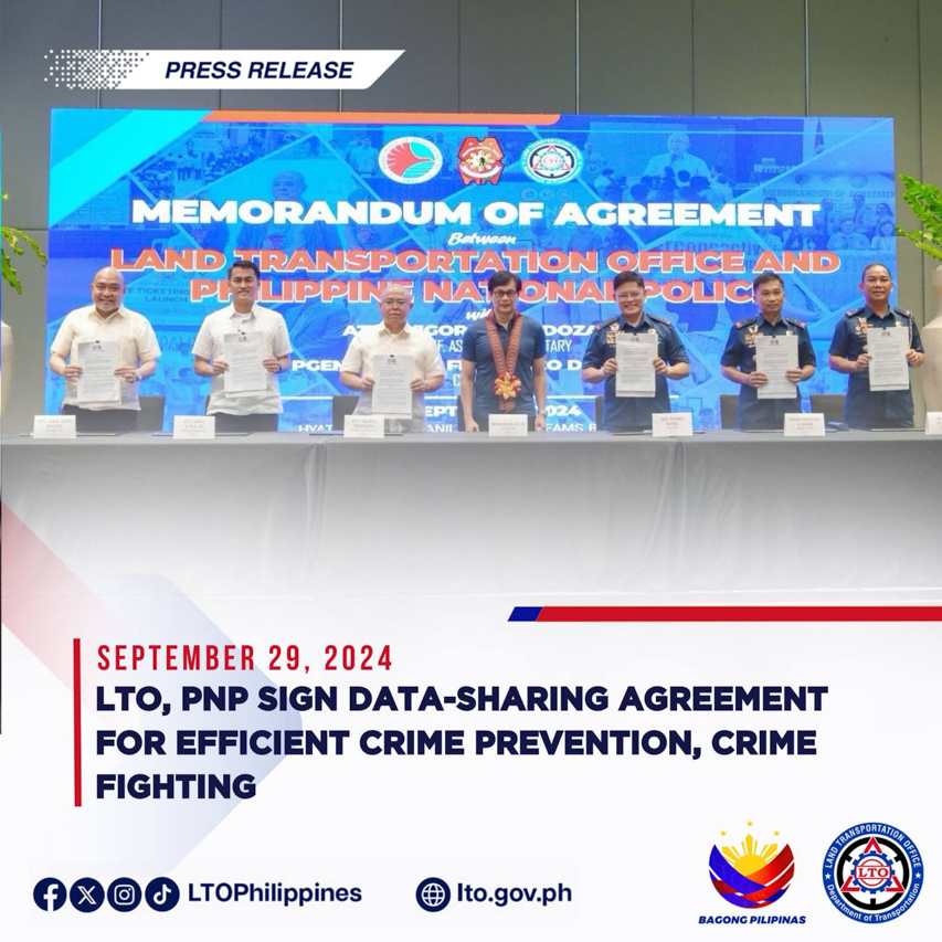 To better combat crime, the Land Transportation Office (LTO) and the Philippine National Police (PNP), have signed a data-sharing agreement that will provide access to police investigators on the records of motor vehicles, particularly those that would be used in criminal activities.