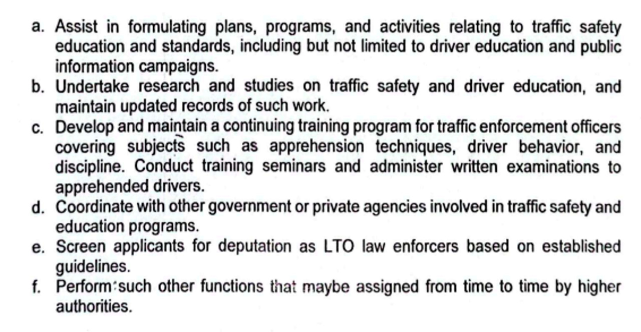 In a recently posted Memorandum Circular issued by the LTO, the agency announced that the Traffic Safety Division (TSD) is hereby realigned from the Law Enforcement Service to be directly under the Office of the Assistant Secretary. As such, the TSD will be under the direct supervision of the undersigned and shall perform several functions: