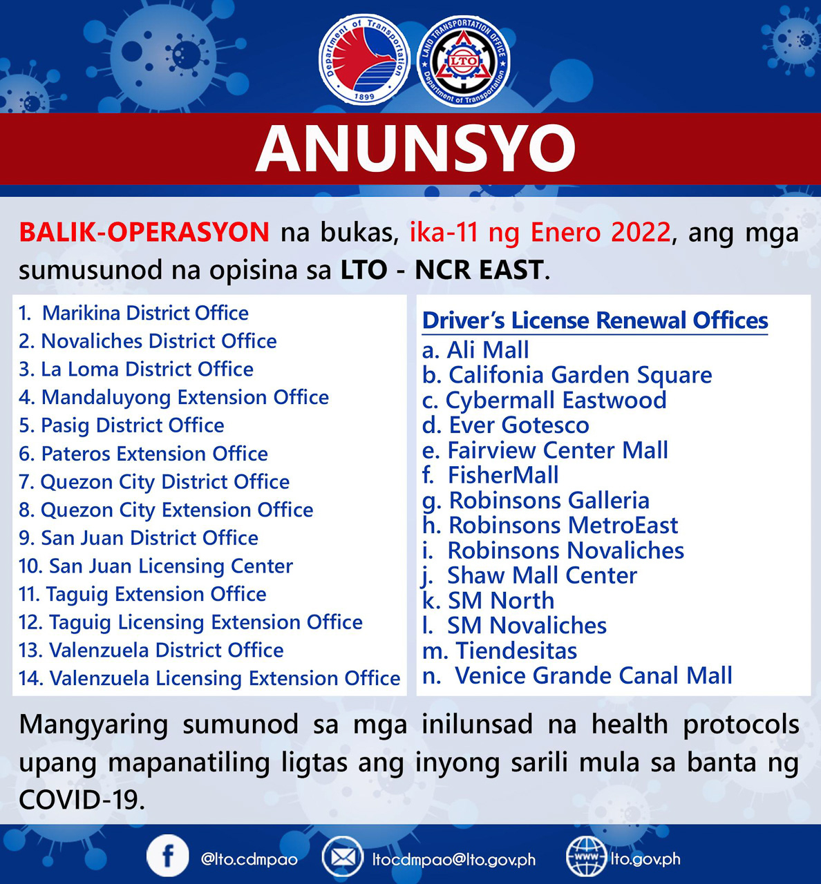 For those planning to visit these locations, the LTO wishes to remind everyone to strictly follow the minimum health and safety protocols. More importantly, everyone must be wearing a face mask in order to transact with LTO employees. As an additional precaution, those who plan to visit DLROs are reminded to bring their vaccination cards as some malls now require visitors to show their vaccination cards.
