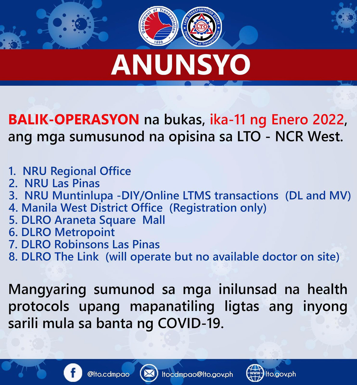 Also reopened are the offices in NCR-West. Those who need to renew their driver’s license or motor vehicle registration can visit the following locations; NRU Regional Office, NRU Las Pinas, NRU Muntinlupa - DIY/Online LTMS, Manila West District Office, DLRO Araneta Square Mall, DLRO Metropoint, DLRO Robinson’s Las Pinas, and DLRO The Link.