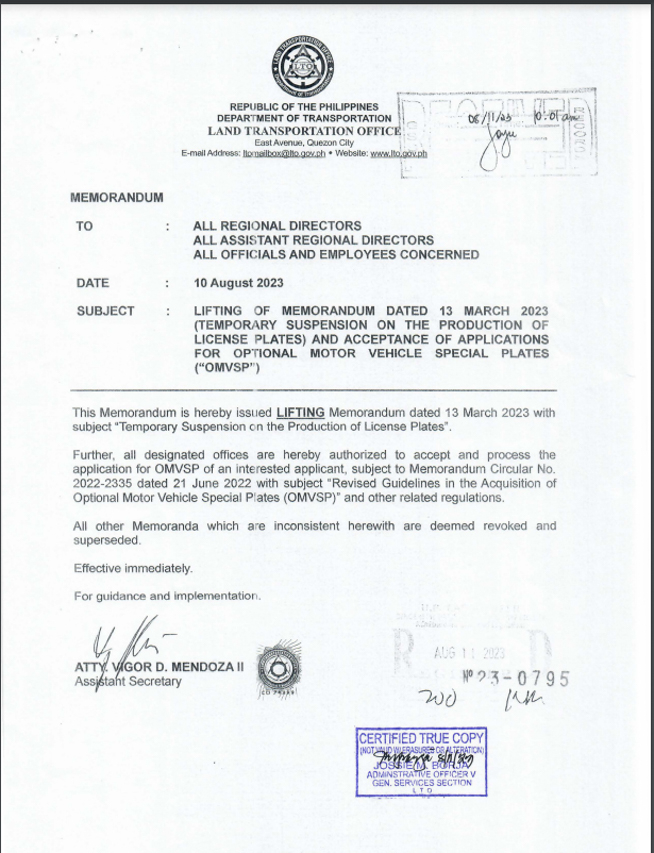 The Land Transportation Office (LTO) has issued a new memo lifting the temporary suspension on the production of license plates. Additionally, the new memo instructs all LTO personnel that the agency will restart accepting applications for the Optional Motor Vehicle Special Plates (OMVSP).