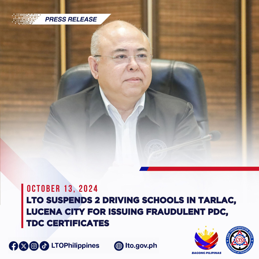 According to LTO, it has suspended the operation of two driving schools based in Tarlac and Quezon provinces for alleged involvement in the fraudulent issuance of Theoretical Driving Course (TDC) and Practical Driving Course (PDC) certificates.