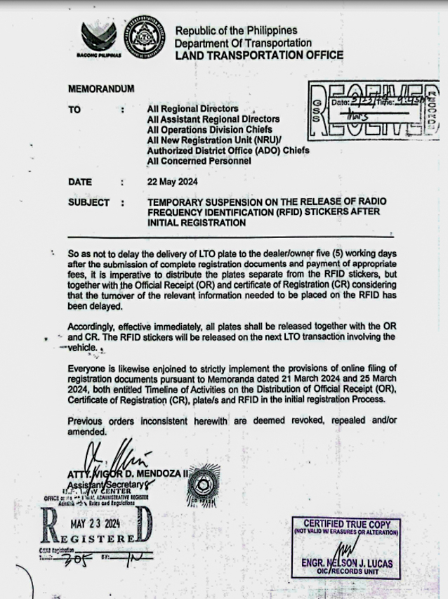 “So as not to delay the delivery of LTO plate to the dealer/owner five (5) working days after the submission of complete registration documents and payment of appropriate fees, it is imperative to distribute the plates separate from the RFID stickers, but together with the Official Receipt (OR) and Certificate of Registration (CR) considering that the turnover of the relevant information needed to be placed on the RFID has been delayed.”