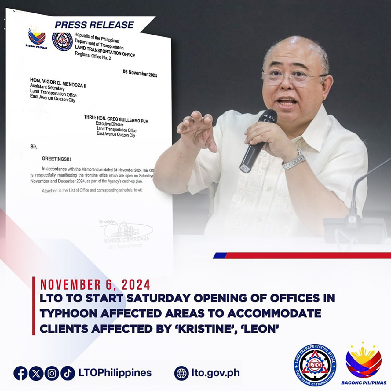 Aside from operating their offices during Saturdays for Calabarzon from November to December 2024, the Land Transportation Office (LTO) recently announced that they will operate several offices during Saturdays in areas affected by Typhoons Kristine and Leon.