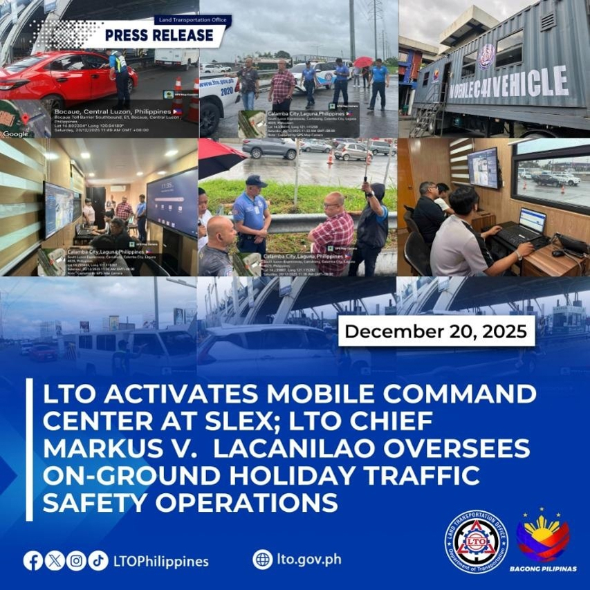 “The Mobile Command Center is LTO’s promise to meet motorists where they are, especially when travel volumes are at their highest this holiday season,” said LTO Asec. Markus Lacanilao. By positioning the MCC on SLEX, Lacanilao added, the LTO can respond faster, prevent road safety issues from escalating, and help ensure travelers reach their destinations safely.