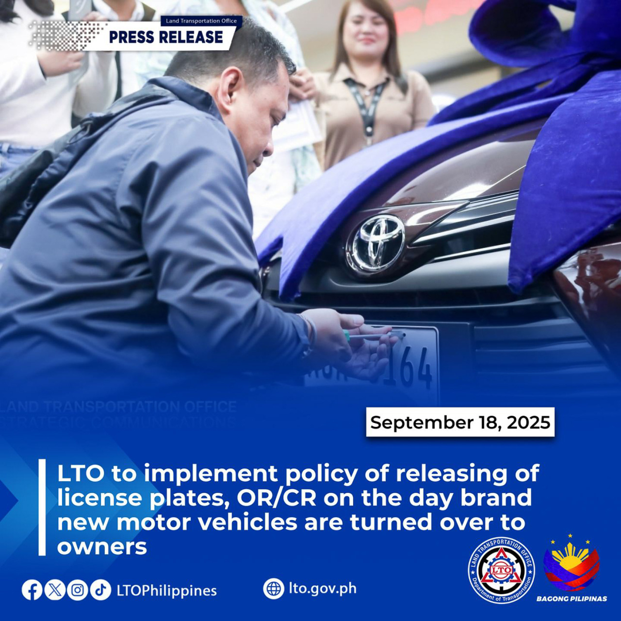 The Memorandum Circular on the guidelines for the same-day registration and release of license plates and OR/CR of all brand-new motor vehicles will take effect on October 15, 2025, or “unless otherwise extended by subsequent issuance.”