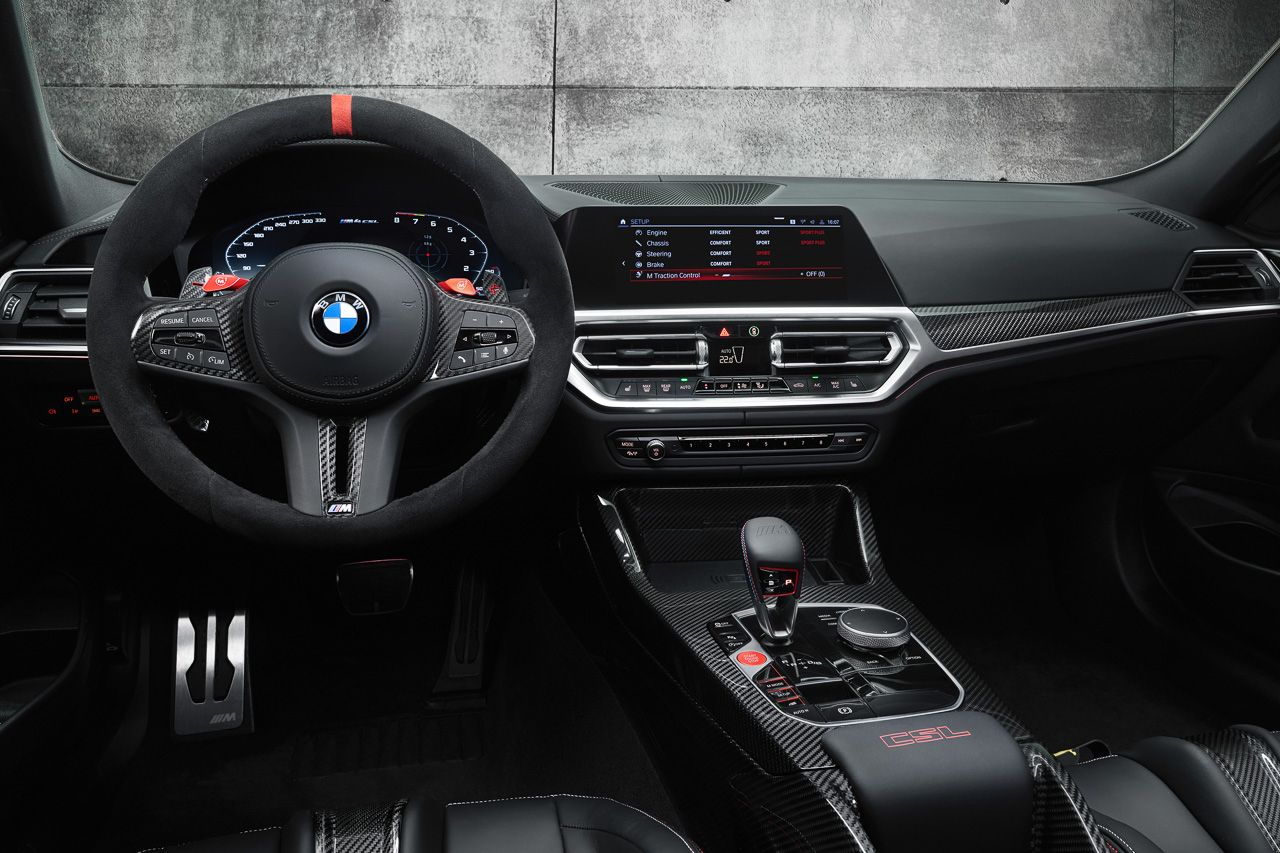 Combined with the exterior carbon-fiber components, use of CFRP, lightweight titanium rear silencer, M Carbon ceramic brakes, and lightweight alloy wheels, springs, and struts, BMW says the M4 CSL only tips the scales at 1,625 kg. BMW even went to the trouble of modifying the kidney grilles, rear lights, floor mats, and automatic climate control to save an extra 4 kg. All of these result in a power-to-weight ratio of 2.95 kg per HP (or 4.01 g per kW) which BMW claims is the ideal platform for a dynamically sublime driving experience.