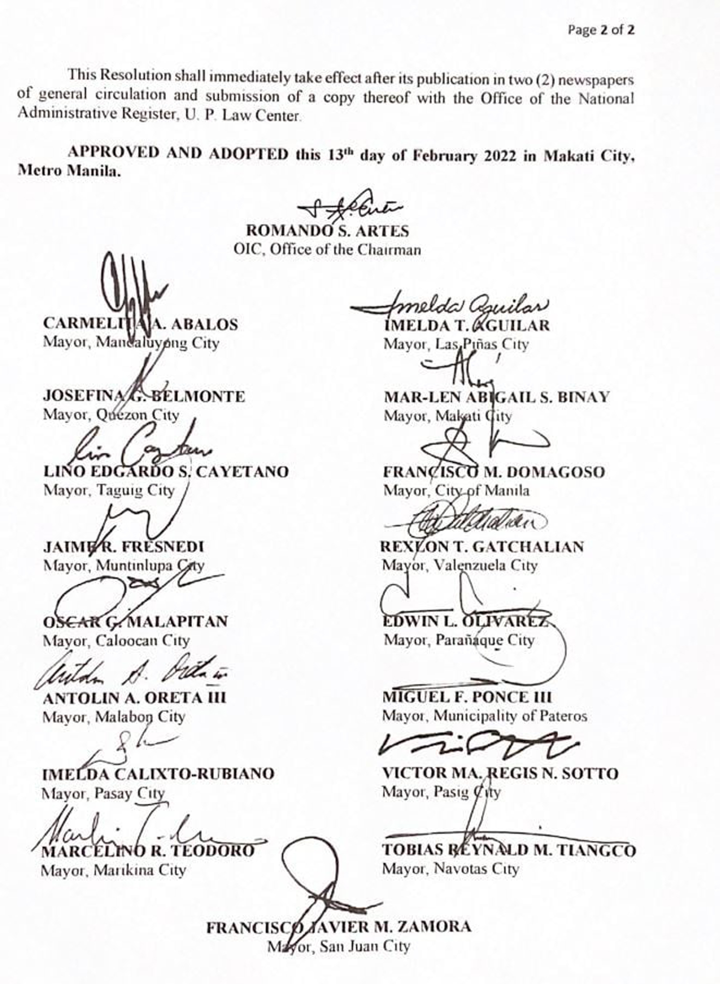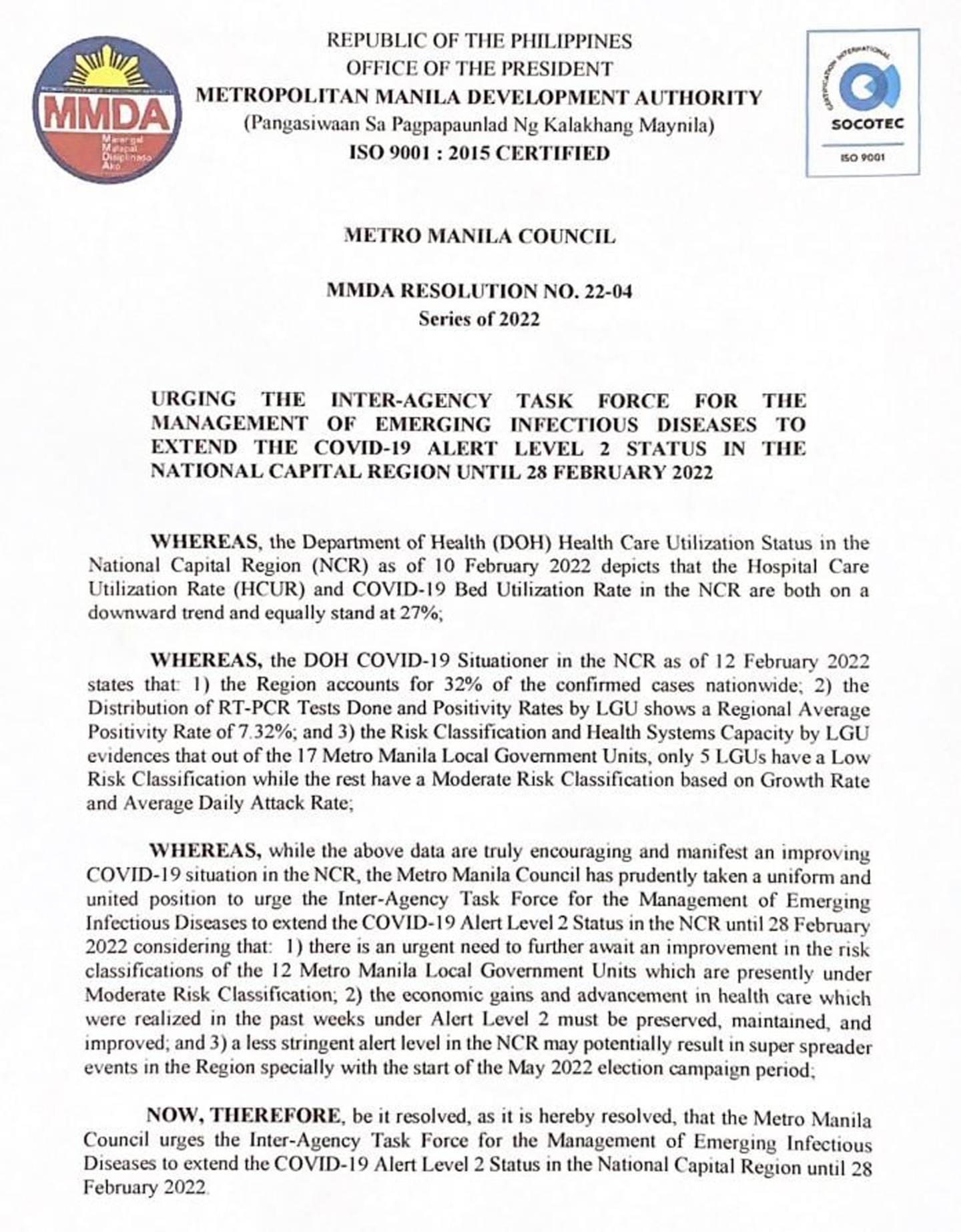 According to Atty. Romando Artes, Officer-in-Charge and General Manager of the Metropolitan Manila Development Authority (MMDA), the MMC has recommended to Inter-Agency Task Force on Emerging Infectious Diseases (IATF) that the Alert Level 2 status in the National Capital Region be extended until the end of February 2022. Subsequently, the council has also unanimously approved the resolution on the retention of Alert Level 2 in the capital region until February 28.