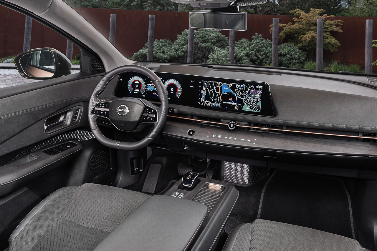 Hop aboard and the Ariya greets the occupants into a minimalistic yet tech-laden cabin. A pair of 12.3-inch digital displays can be seen inside and serve as the instrument cluster and touchscreen infotainment system. One will also immediately notice the lack of physical buttons on the dashboard. This is because Nissan used a touch-sensitive panel to manage some of the in-car functions like climate control, drive modes, and more.
